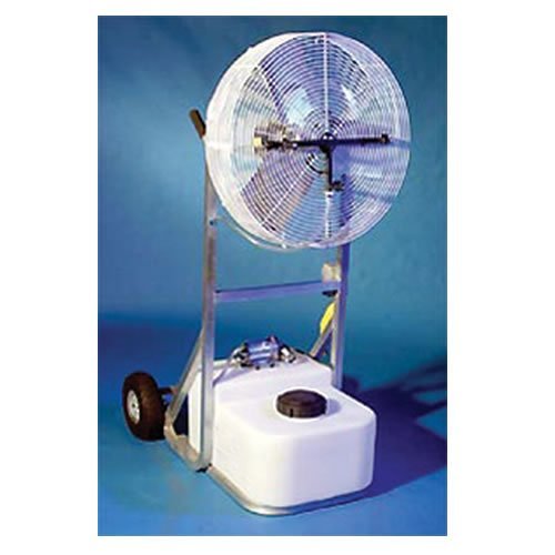 Beat the heat! Air cooling fans provide efficient and effective cooling from portable units without the hassles of garden hoses and water being sprayed on everyone. 20" Fan with patented valved nozzles for mist regulation. No more spitting waterfalls!. Self contained 15 gallon water tank with 6-8 hours running time. Aircraft aluminum frame for indoor/outdoor use. Provides cooling up to 100' away.